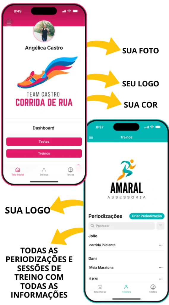 Sua logo, cores e nome estarão presentes em cada detalhe do app, mas o que realmente faz diferença é o que acontece por trás, o sistema calcula zonas, ritmos e planos completos automaticamente, entregando treinos prontos e precisos para cada corredor.