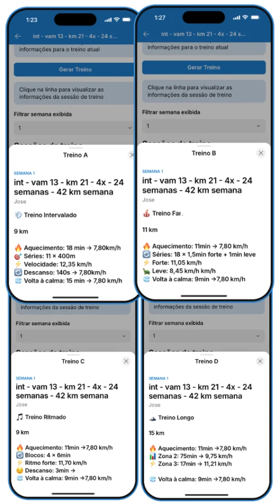 Cada sessão de treino no Periodiza Run mostra informações essenciais para o corredor executar o treino com precisão: